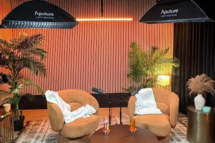 The podcast studio is built out with sound and lighting equipment, ready for use at any moment.
